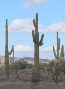 After the Gila NF we popped out into desert and saw our first saguaro cactus. They lined the roadway like sullen sentinels with their arms raised threatening to pummel the unwary. I find them intimidating. A few of these slow growing giants had to be over 30 feet tall and I couldn’t help but wonder how they withstand the blast of wind from a T-storm. Beautiful does not come to mind when I look at them, but without a doubt they command respect.