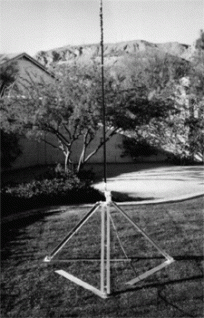 The odd looking aluminum contraption in the photo is the Outpost tripod which ends up unfolding a la a child’s “transformer”. Not exactly human-engineered when it comes to deployment, but once everything is properly extended and a couple spikes are driven through the holes in the 3′ long feet, it’s a very stable platform that usually negates the need for added radials.