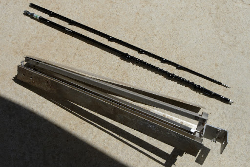 SteppIR verticals are great antennas but they’re pretty big (33′) and inappropriate for our use on an RV as they don’t disassemble easily for thransport when we’re moving the rig. However, our old Outbacker antenna (Outreach 500 model) stows easily in 2-pieces in its 4′ bag. When I bought the Outbacker in 2003, I also bought an Outpost tripod (made by Alpha Delta) which was designed for Outbacker antennas and works quite well (useable on other mobile or portable antennas too). In the photo, the 2 pieces of the antenna (black) are each about 4′, though the assembled length of the Outreach is about 11′ 5″ with the stinger extended.