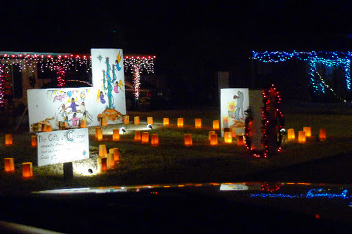 Mike did his homework and got us there quickly: I-10 to Exit 255. N on Miracle Mile (past the NoTell Motel… seriously!) to Oracle, 2 blocks left to Ft. Lowell, then down Ft Lowell to Christmas Ave. He even found a map of the neighborhood that showed the proper route to drive through the neighborhood. It needs to be organized cuz there are a lot of cars! Tucson police control all vehicle access and each of the entry points is lighted with emergency lighting. There are only 3 nights when cars are permitted into the area, otherwise you have to make it by foot. There’s an entry fee: as many canned goods as you can afford. The only problem I saw is that pedestrians are permitted onto the same streets as the cars, so it can get a little scarey and we needed to stay alert.