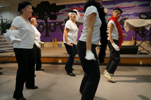 They also got residents and visitors on stage for things like the park’s annual Out Takes. Celia goes to a 3 times-per-week line dance class and her dance buddy Kim asked Celia plus 3 additional line dancers to perform a line dance done to a Glen Miller medley. They christened themselves The Miller Mamas, were the first act on and were awarded great applause. Well done Admiral!