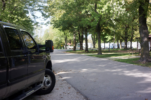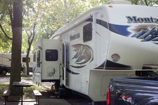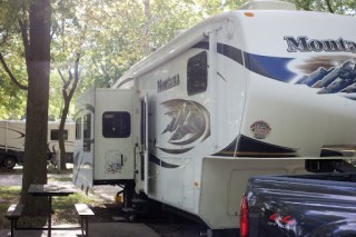 All the great looking oak trees rained acorns the whole time we were there. The concern is that when I close the slides they would get crushed against the slide seals. So I had a brain storm the morning when we pulled out: fire up the compressor and blow the acorns and leaves off the tops of the slides. Cool, huh?! Yeah, right. Turns out the air would blow everything away that was within about 3-4 feet and did nothing to any acorns or leaves beyond that. It was like an invisible wall. So much for the brain storm. I had to squeegee them off with the window cleaner I have for the truck.