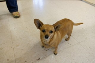 | This little guy is a chi-weenie… chihuahua/Dachshund mix. He does a good job of getting diners to share their food! |